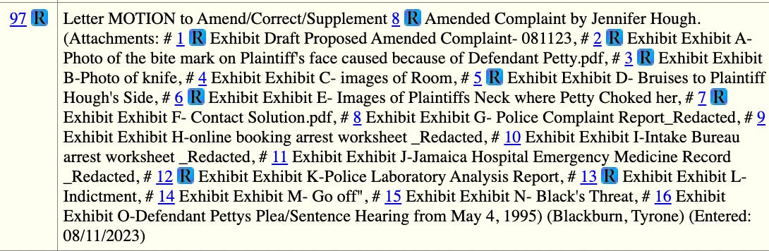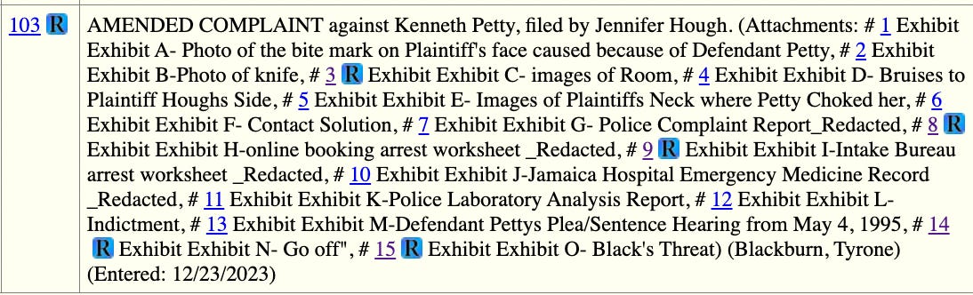 The amended complaint filed Saturday in the Eastern District of New York in Brooklyn officially incorporates the exhibits into the lawsuit, first filed in August 2021, per the order of U.S. Magistrate Judge James Cho, who ruled in October it was too late to add a new claim but authorized Hough to amend her complaint to include the information she’d obtained from the Queen District Attorney’s Office, which prosecuted Petty in 1994.