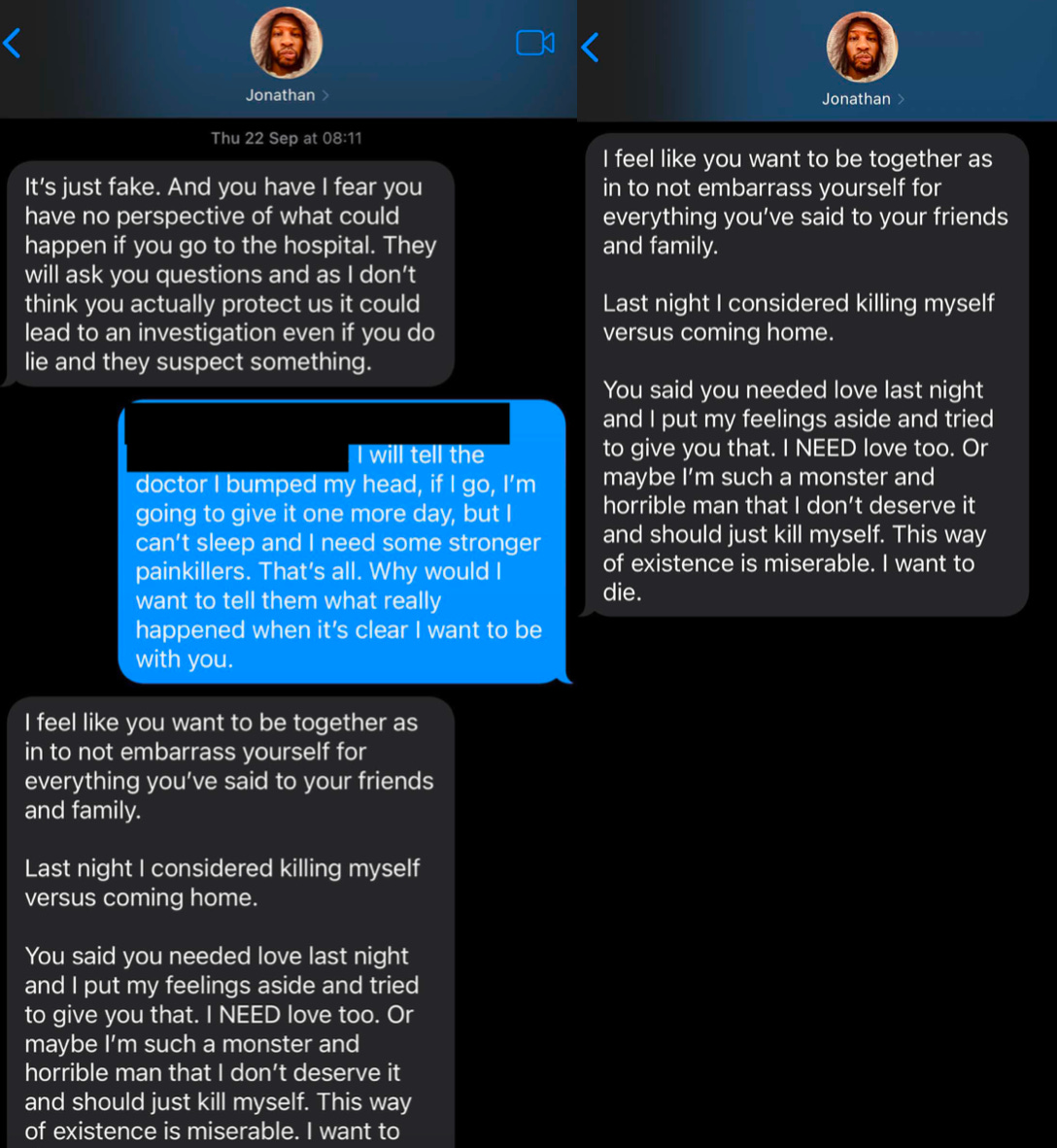 Earlier, Majors texted her, “It’s just fake,” though it’s unclear what he was referring to. He also texted, “I fear you have no perspective of what could happen if you go to the hospital. They will ask you questions and as I don’t think you actually protect us it could lead to an investigation even if you do lie and they suspect something.”