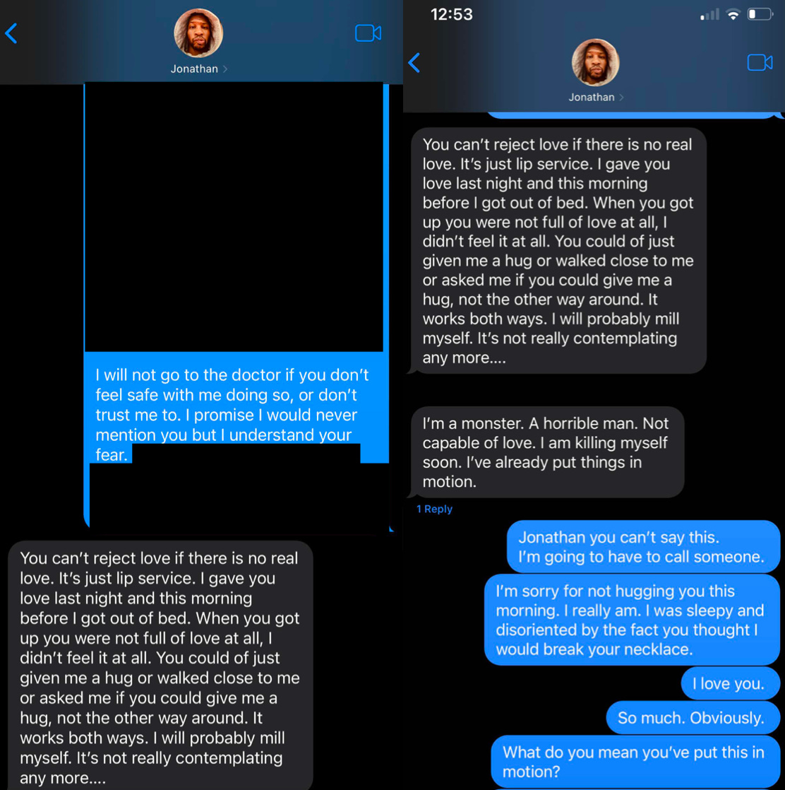 The texts are partly redacted, and they don’t show what Jabbari texted Majors before he told her, “I will probably mill myself,” mistyping “kill.”