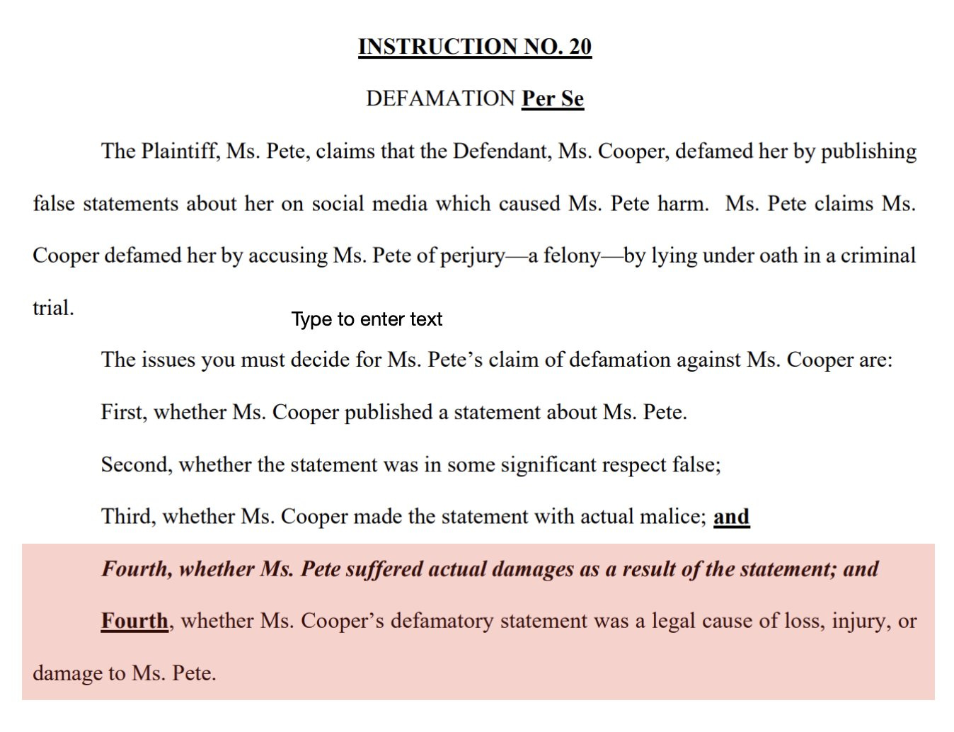 “Do you know if Ms. Cooper was aware of the impact her public statements were having on Ms. Pete?” the attorney asked.