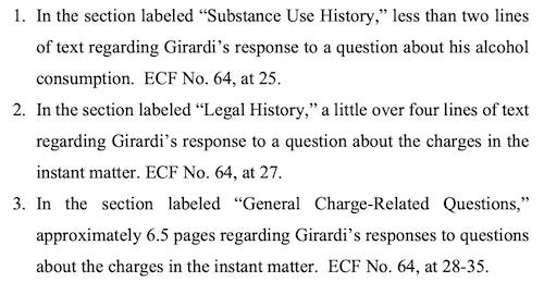 Paetty and Moghaddas acknowledge they can’t use incriminating statements Girardi made during Goldstein’s evaluation in their criminal case “unless he raises a mental status defense.” But they say the 5th Amendment doesn’t apply to his competency evaluation because it “does not involve a determination of guilt.”