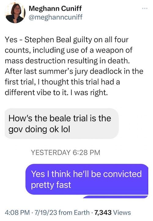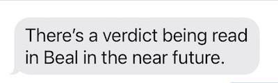 As I stated in the above message from Wednesday night, I expected Beal to be swiftly convicted. I didn’t expect it to happen as fast as it did, but the fact that it did was hardly surprising. Still, I was lucky: I was about to leave for the day when I saw the defense go into the courtroom. Prosecutors arrived a few moments later. I initially thought it was a note, but then I got this text.