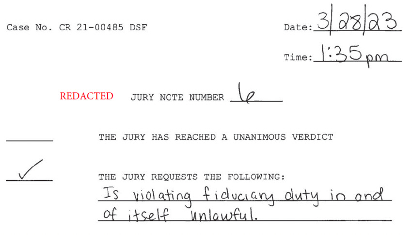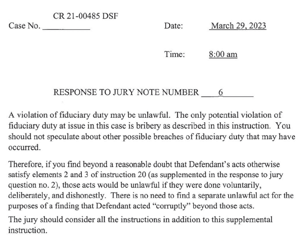 As I reported at the time, U.S. District Judge Dale S. Fischer mulled striking the instruction altogether after the jury sent note #5. But she didn’t, instead responding to the jury’s question this way: