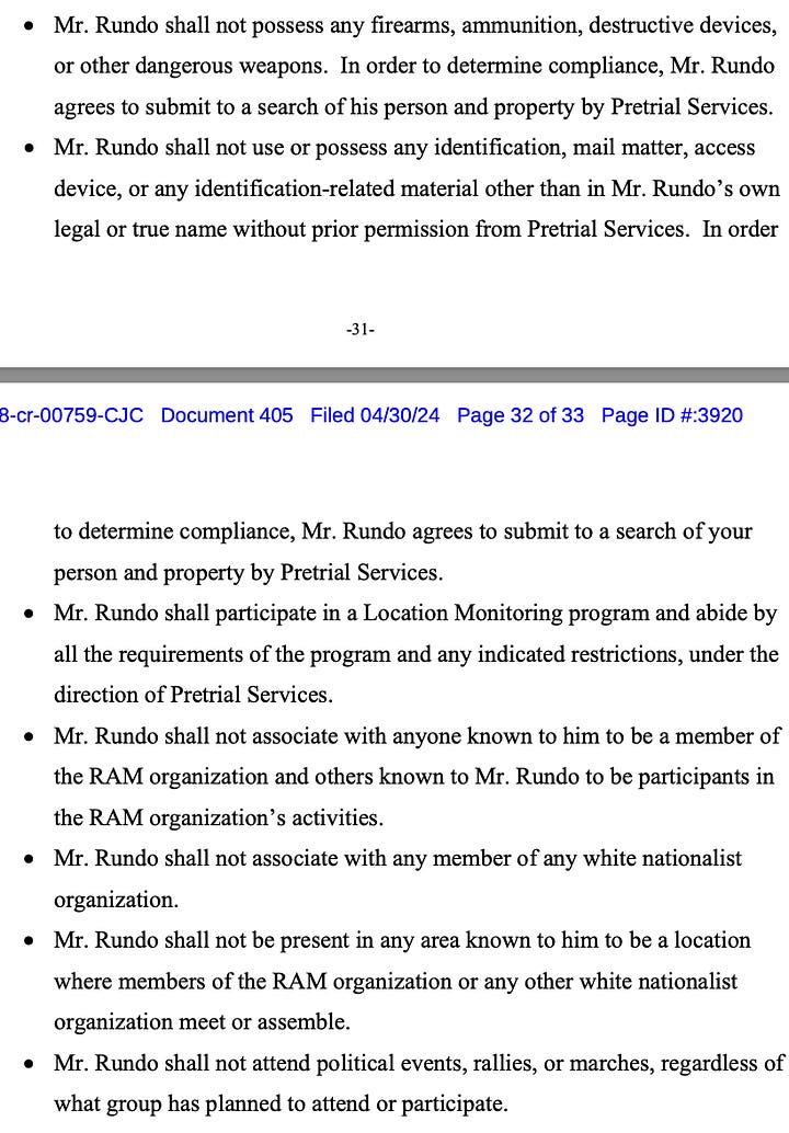 It’s unclear if Carney’s stay was needed: The 9th’s March 13 order said any release order for Rundo “shall be automatically stayed for 96 hours,” which indicates a stay would have been in place via that order as soon as Carney authorized Rundo’s release.