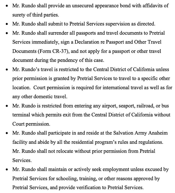 The judge said he knows Rundo may be a flight risk, but the standard for bail doesn’t require a total guarantee of appearance, only that conditions are in place to reasonably assure it.