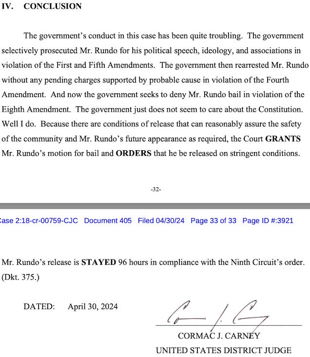Tuesday’s order recounts the recent history of Rundo’s case and calls the government’s conduct “quite troubling.”