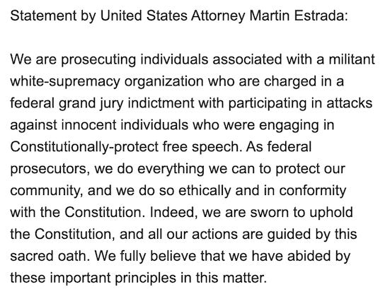 The order drew a rare response from Martin Estrada, the top U.S. attorney for the Los Angeles-based Central District of California, who had until Tuesday not commented on Carney’s stance that the DOJ not only unconstitutionally prosecuted Rundo, but arrested him without probable cause after the judge dismissed his charges in February.