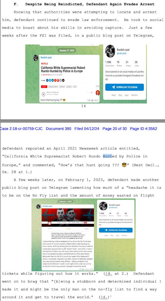 Prosecutors cited the IDs and passport in their 30-page opposition to Rundo’s bail motion. They also included screenshots from Rundo’s Telegram account in which he shared an article headlined “California White Supremacist Robert Rundo Hunted By Police in Europe” about European officials and wrote, “How’s that hunt going ???”
