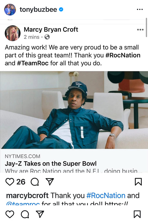 Croft is not an attorney on the case, but Buzbee said in his lawsuit against her and Roc Nation that he’ll seek disciplinary action “against the law firms who accepted referrals of the cases from Defendant Marcy Croft.” He also said the lawsuits filed so far are part of a scheme and “utterly frivolous and patently false.”