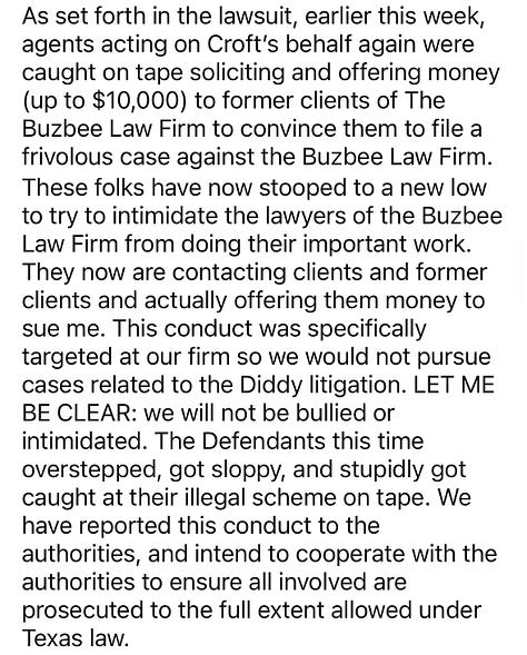 Buzbee said on Instagram Wednesday that the tactics were “specifically targeted at our firm so we would not pursue cases related to the Diddy litigation.”
