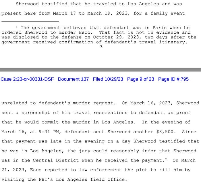 If prosecutors were to transfer the case to another district, the only obvious option is the District of Nevada because that’s where Sherwood was when Khalilian allegedly used WhatsApp to arrange for him to murder Esco. The defense said in a filing on Sunday that prosecutors “charged this case in the wrong district.” Prosecutors disclosed on Sunday that Khalilian was in Paris at the time.