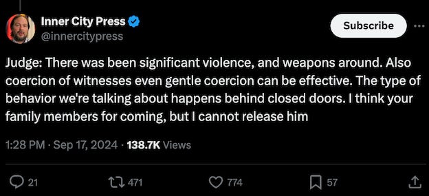When ordering Combs detained, Tarnofsky cited allegations of significant violence as well as the presence of weapons and allegations of witness coercion.