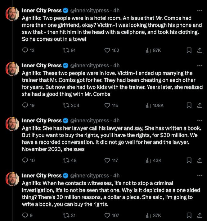 Agnifilo discussed the hotel assault and Ventura’s lawsuit in court on Tuesday, describing it as a fight about Combs seeing other women. He said Combs is not a perfect person, but his toxic relationships were mutual and he’s trying to be better for the rest of his days. He also said Combs wrote a very large check to someone he was in a relationship with for 10 years. People got in line for their checks. (These are paraphrases via dedicated SDNY courts live tweeter Matthew Lee of Inner City Press.)