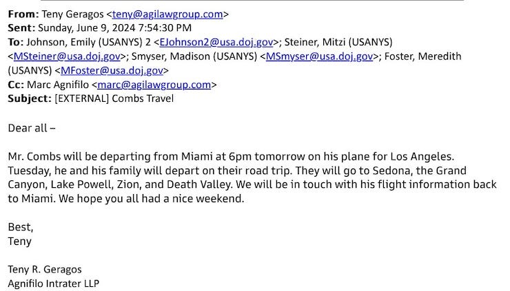 Combs’ lawyers included as exhibits emails with prosecutors after the last few month discussing Combs’ travel. One in June said he was departing Miami “on his plane for Los Angeles” and would be going on a “road trip” with his family.