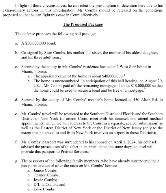 His lawyers say he’ll post a $50 million bond and use his $48 million Miami home and his mother’s home as equity. His mother, sister and three sons will co-sign his bond, as will the mother of his oldest daughter, and he’ll also stay at home on an ankle monitor and will stay in Florida or New York for court appearances.