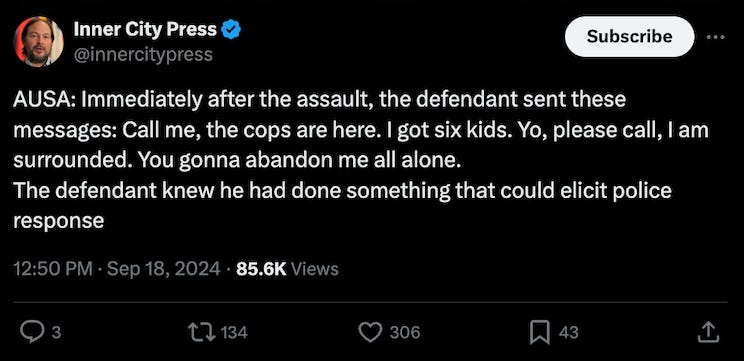 On Wednesday, Johnson told Judge Carter that Combs messaged Ventura after the assault and told her police arrived and “I got six kids” and “Yo, please call. I am surrounded. You gonna abandon me all alone.”