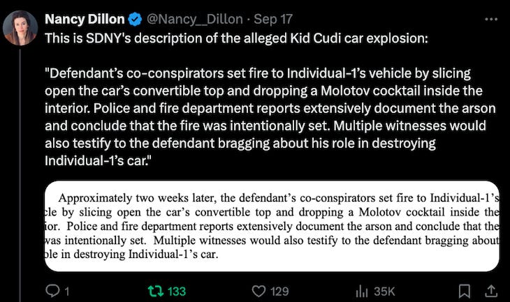 Prosecutors also said Combs’ coconspirators set fire to a car “by slicing open the car’s convertible top and dropping a Molotov cocktail inside the interior.”