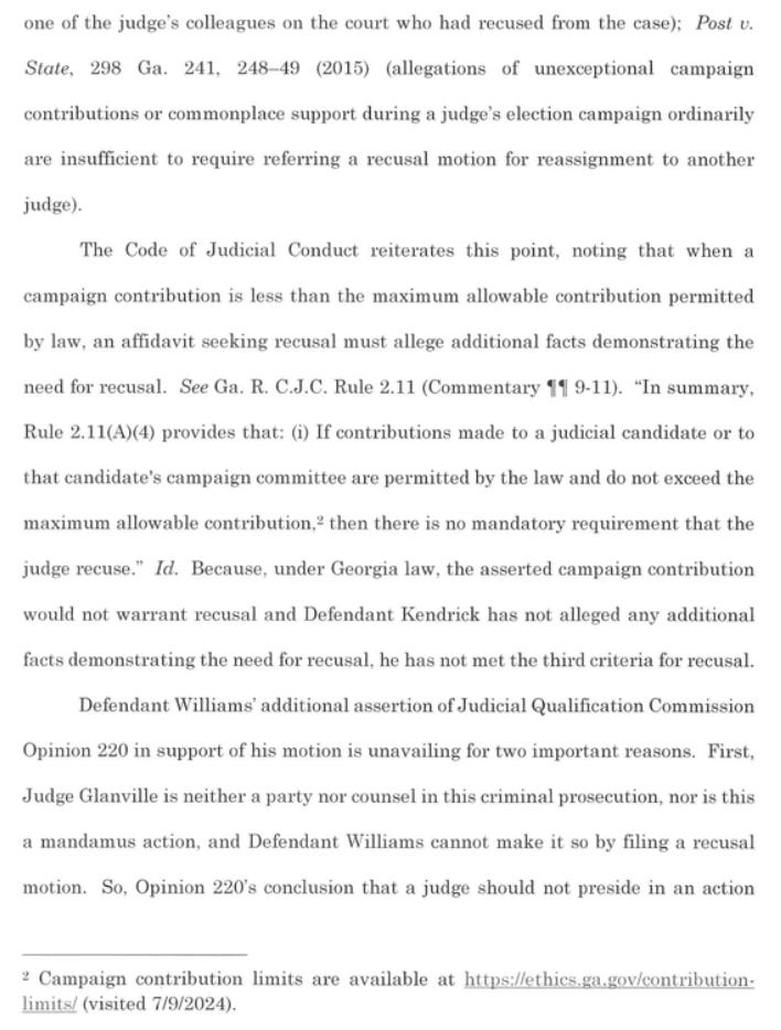 “The Georgia Supreme Court has held that the mere fact of a campaign contribution to a judge — even from a party to the case — does not warrant recusal where the contribution was not exceptionally large,” according to the order from Fulton County Superior Court Judge Rachel Krause in Atlanta.
