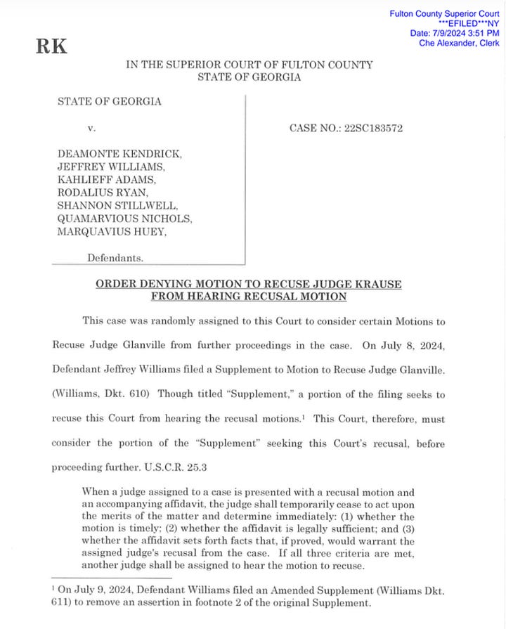 The judge also rejected a motion from attorneys for Williams’ co-defendant Deamonte Kendrick that sought to recuse all Fulton County Superior Court judges from deciding the Glanville recusal motions.