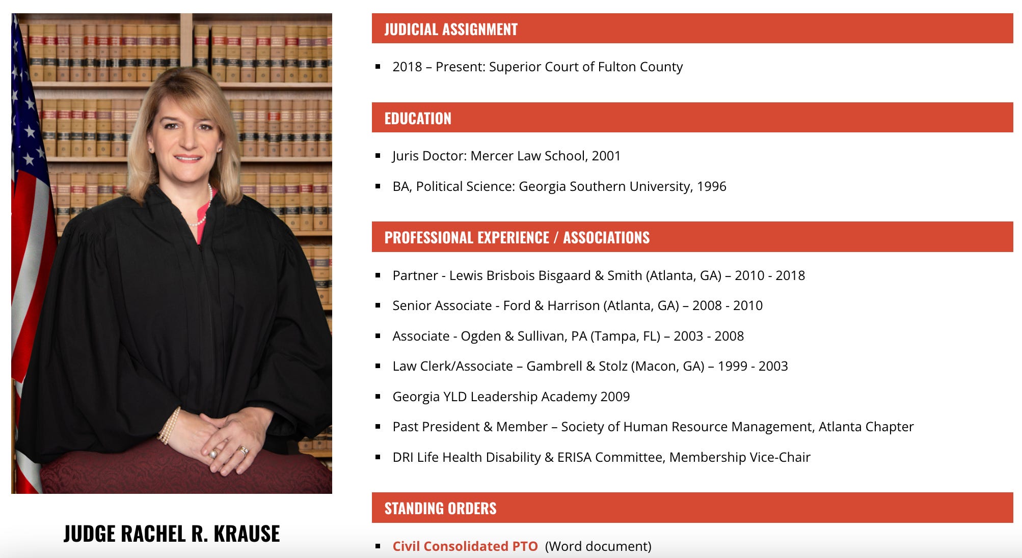 Krause has been a Fulton County Superior Court judge since January 2019. She earned her law degree in 2001 from Mercer Law School in Macon, Georgia, and worked in private practice for 20 years, including eight years as a partner in the Atlanta office of Lewis Brisbois Bisgaard & Smith LLP.