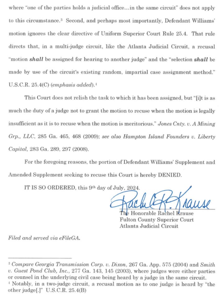 “This Court does not relish the task to which it has been assigned, but ‘[i]t is as much the duty of a judge not to grant the motion to recuse when the motion is legally insufficient as it is to recuse when the motion is meritorious,’” Judge Krause wrote, quoting a 2009 Georgia Supreme Court decision that said a trial court judge shouldn’t have been recused from a lawsuit against a county that was paying him $2,700 annually.
