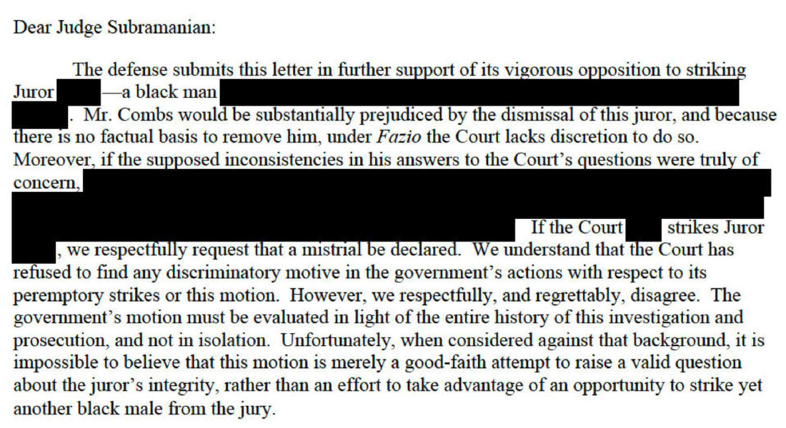 “The government’s motion must be evaluated in light of the entire history of this investigation and prosecution, and not in isolation,” according to the letter signed by Alexandra Shapiro of Shapiro Arato Bach LLP in New York City. “Unfortunately, when considered against that background it is impossible to believe that this motion is merely a good-faith attempt to raise a valid question about the juror’s integrity rather than an effort to take advantage of an opportunity to strike yet another black male from the jury.”