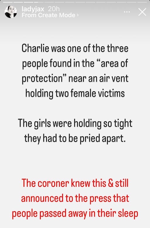 “The coroner knew this & still announced to the press that people passed away in their sleep,” she wrote.