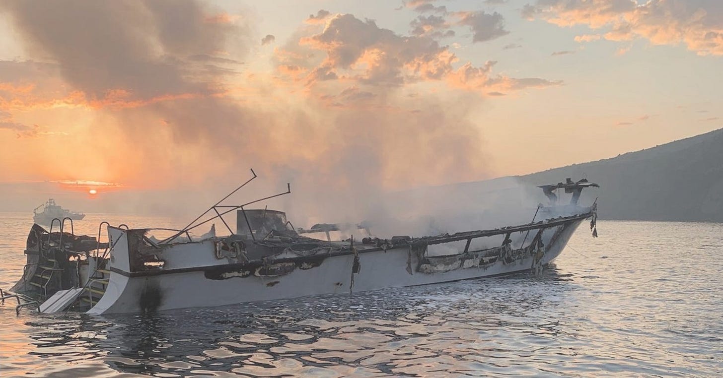 Within a minute, Boylan made a mayday call to the U.S. Coast Guard, then jumped overboard. His crew had jumped down to a lower deck, but instead of giving them firefighting directions, Boylan told them to jump overboard, too. The boat’s public announcement system was next to the Coast Guard radio, but Boylan never warned the 34 people sleeping in the bunk room that a fire was burning upstairs.