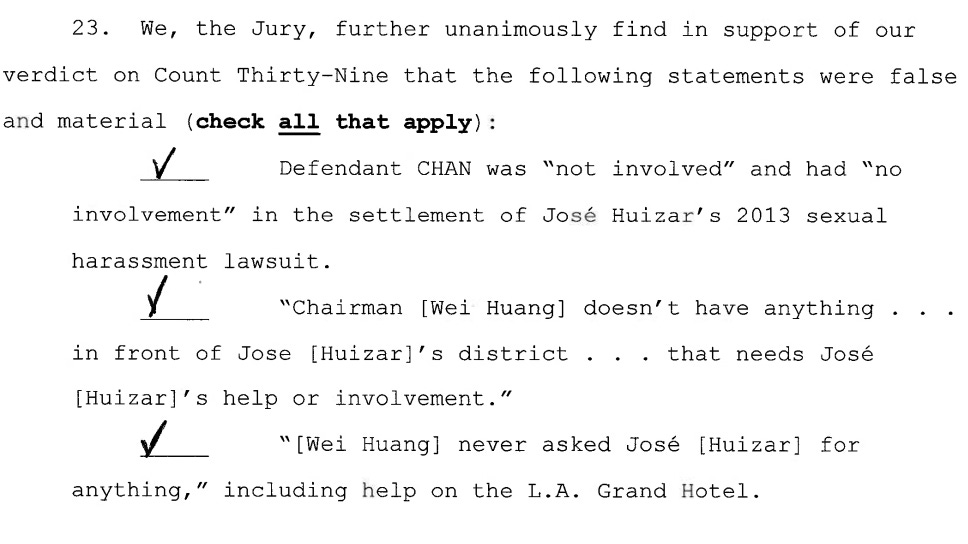 The fast deliberation followed a 12-day trial about an organized crime syndicate led by now-former Los Angeles City Councilman José Huizar that included key support from Chan by way of contacts with developers and bribes that he secured for Huizar and himself.