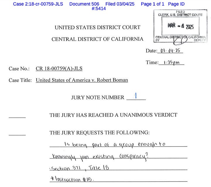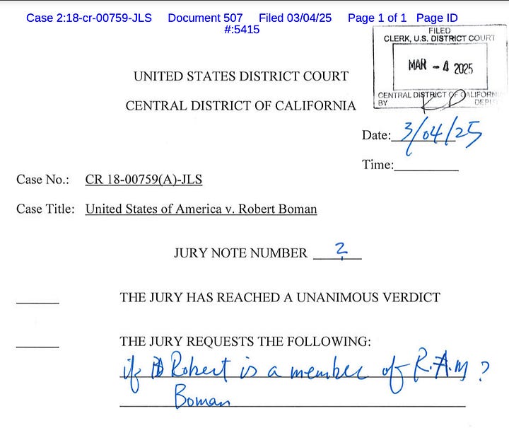 Jurors deliberated about 2 1/2 hours before they asked two questions: “Is being part of a group enough to knowingly join existing conspiracy?” and “if Robert Boman is a member of RAM.” They reached a verdict before they heard the answers.