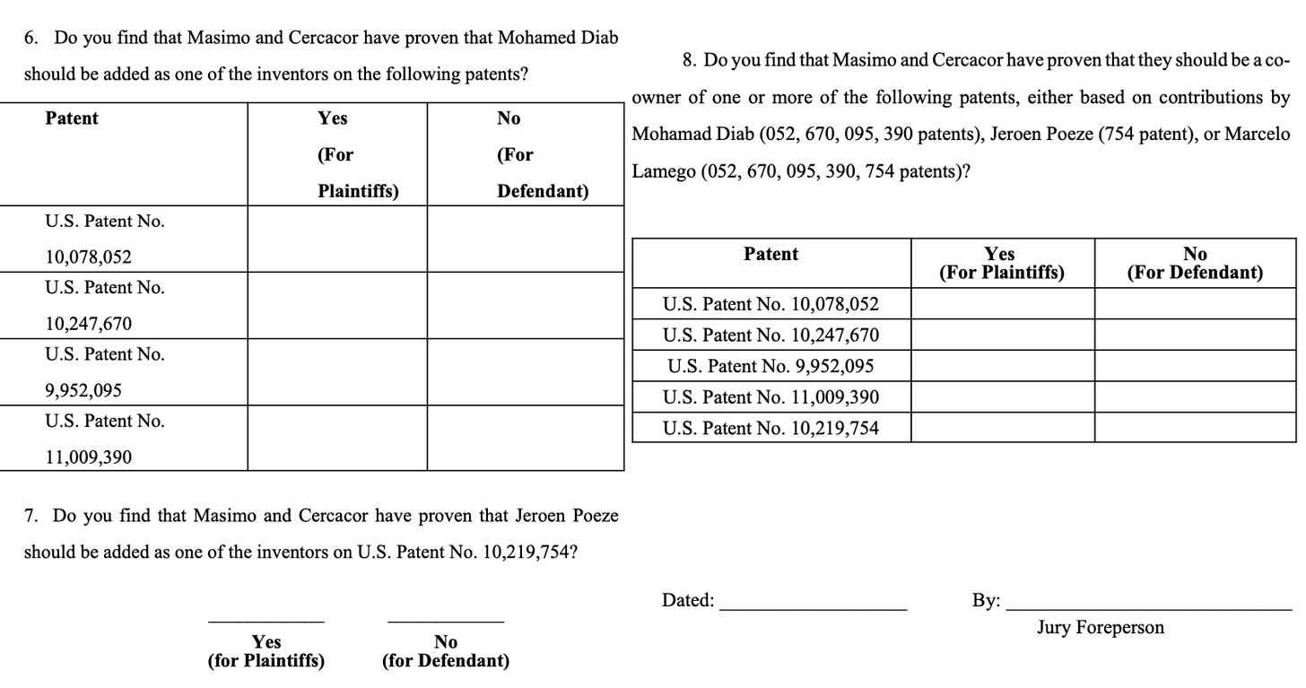 Mueller highlighted testimony from Masimo’s Mohamed Diab and Jeroen Poeze that they don’t know if they should be added as inventors to the very patents Masimo wants them declared co-inventors.