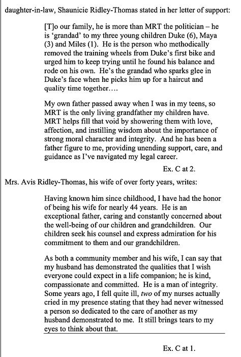 “He has devoted decades to serving others, to empowering historically silenced voices, to doing everything in his power to make Los Angeles a better place. He is responsible for a host of programs—from the Empowerment Congress, to the Blue Ribbon Commission, to Measure H, to Martin Luther King Jr. Hospital—that have done just that. His work has changed and saved lives. But as the letters make clear, he has also transformed many lives of people he has interacted with on an individual level. There are people in this community who were inspired to become public servants because of Dr. Ridley-Thomas. For decades, he displayed a level of commitment to service that went above and beyond any of his job descriptions. His sentence should reflect that.”