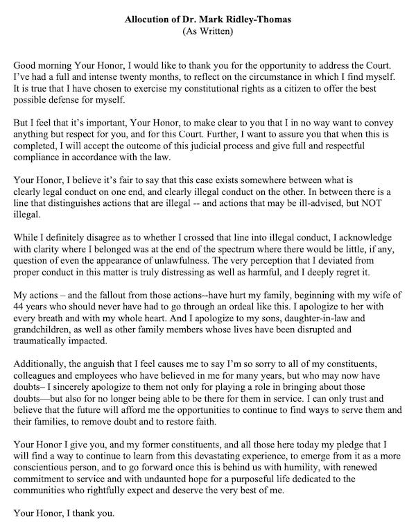 “While I definitely disagree as to whether I crossed that line into illegal conduct, I acknowledge with clarity where I belonged was at the end of the spectrum where there would be little, if any, question of even the appearance of unlawfulness. The very perception that I deviated from proper conduct in this matter is truly distressing as well as harmful, and I deeply regret it,” Ridley-Thomas said.
