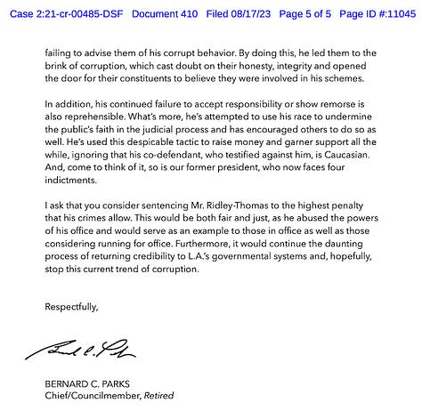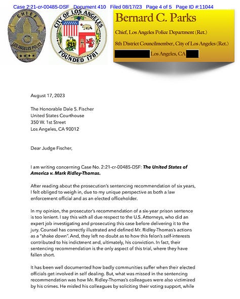In a rarity, prosecutors received a letter calling for Ridley-Thomas to receive more than their recommended six years. It was from Bernard C. Parks, a retired Los Angeles city councilman and retired chief of the Los Angeles Police Department who said prosecutors’ memo missed “how Mr. Ridley-Thomas’s colleagues were also victimized by his crimes.” Parks preceded Ridley-Thomas in 2003 as city councilman for Los Angeles’ 8th District; Ridley-Thomas was elected to the Council again in 2022 in the 10th District after serving 12 years on the Los Angeles County Board of Supervisors. He committed his federal crimes while board chairman but was on the City Council when he was indicted for them.