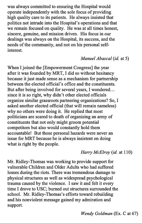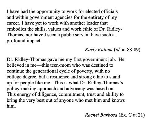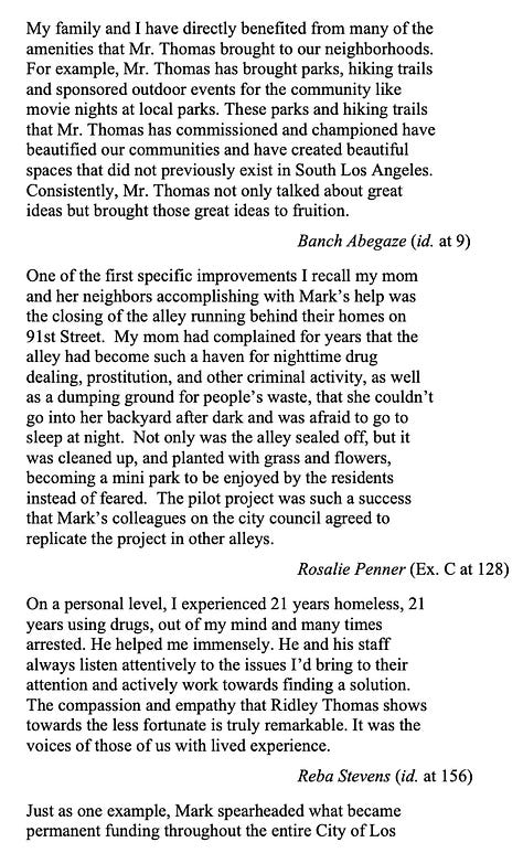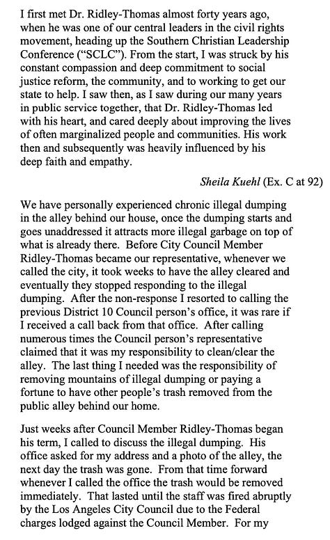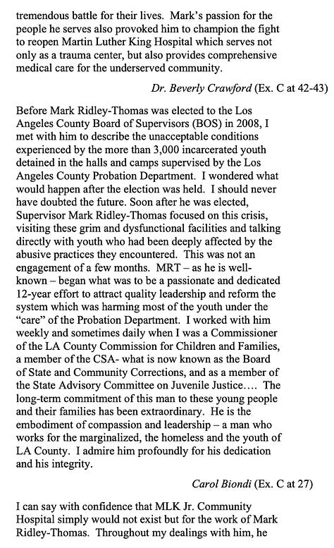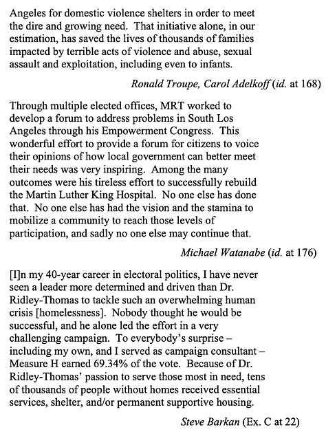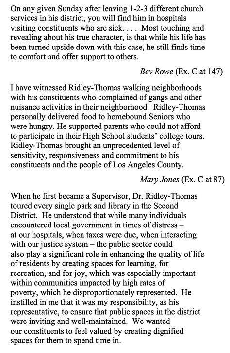 The defense said it’s “nearly impossible to properly chronicle the improvements Dr. Ridley-Thomas has made in the lives of his constituents” but his more than 130 support letters offer “the best account.”