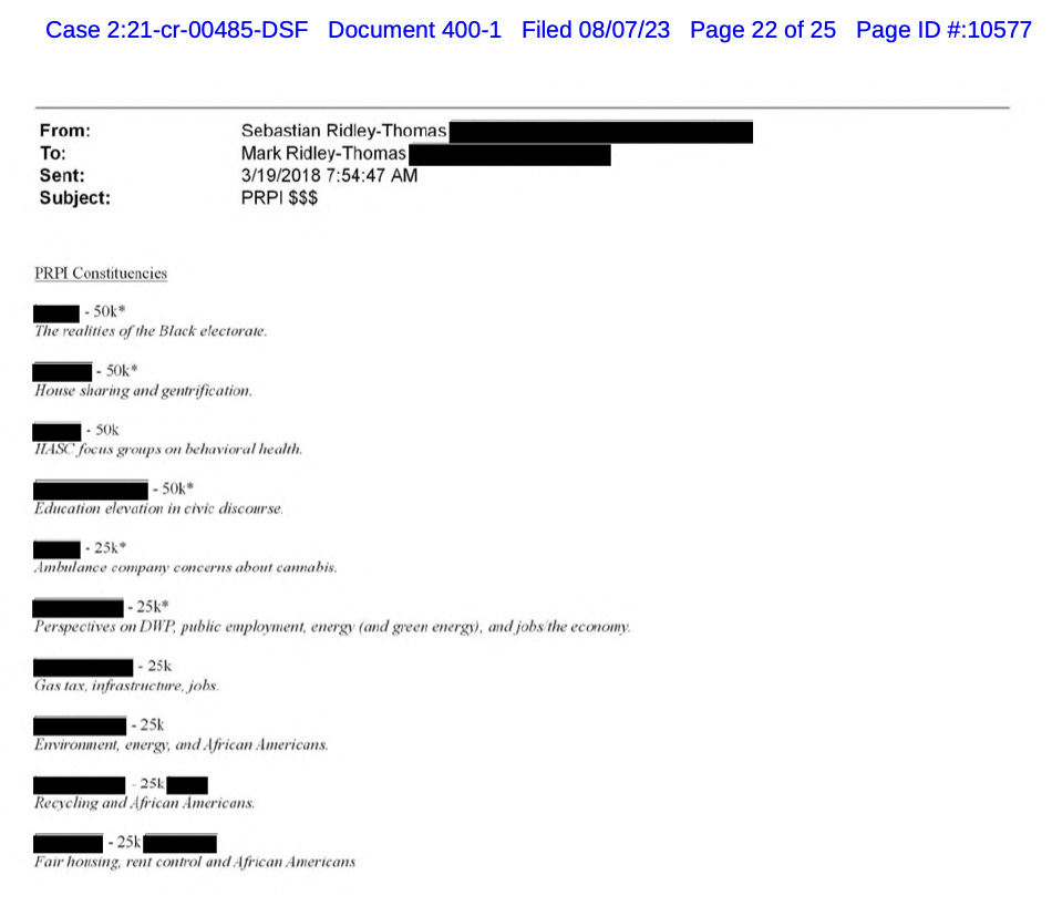 “The email listed 10 individuals and entities and, next to each name, a dollar amount and the government business relevant to the individuals and entities,” prosecutors wrote. The subtext was plain: If defendant could assist these persons and entities with their government business, Sebastian Ridley-Thomas could get donations for PRPI in the dollar amounts listed.”