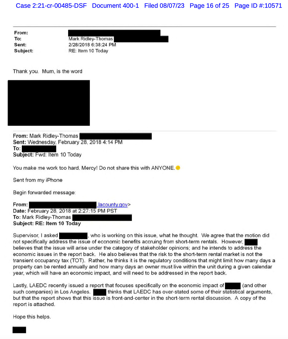 Prosecutors in their memo revealed another incidence of Ridley-Thomas leveraging Los Angeles County business to gain benefits for his son that jurors didn’t hear about in trial. It involved a county contract regarding short-term rentals, to which Ridley-Thomas proposed an amendment that exactly matched an amendment sought by a lobbyist who contacted him. Ridley-Thomas emailed the lobbyist a report about short-term rentals sent to him by another county officials and wrote, “You make me work too hard. Mercy! Do not share this with ANYONE 😉.”