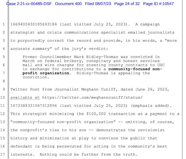 “A campaign strategist and crisis communications specialist emailed journalists to purportedly correct the record and provide, in his words, a “more accurate summary” of the jury’s verdict: Former Councilmember Mark Ridley-Thomas was convicted in March on federal bribery, conspiracy and honest services mail and wire charges for steering county contracts to USC in exchange for contributions to a community-focused nonprofit organization. Ridley-Thomas is appealing the conviction. (Twitter Post from Journalist Meghann Cuniff, dated June 26, 2023, available at https://twitter.com/meghanncuniff/status/1673388331567312896 (last visited July 25, 2023) (emphasis added).”