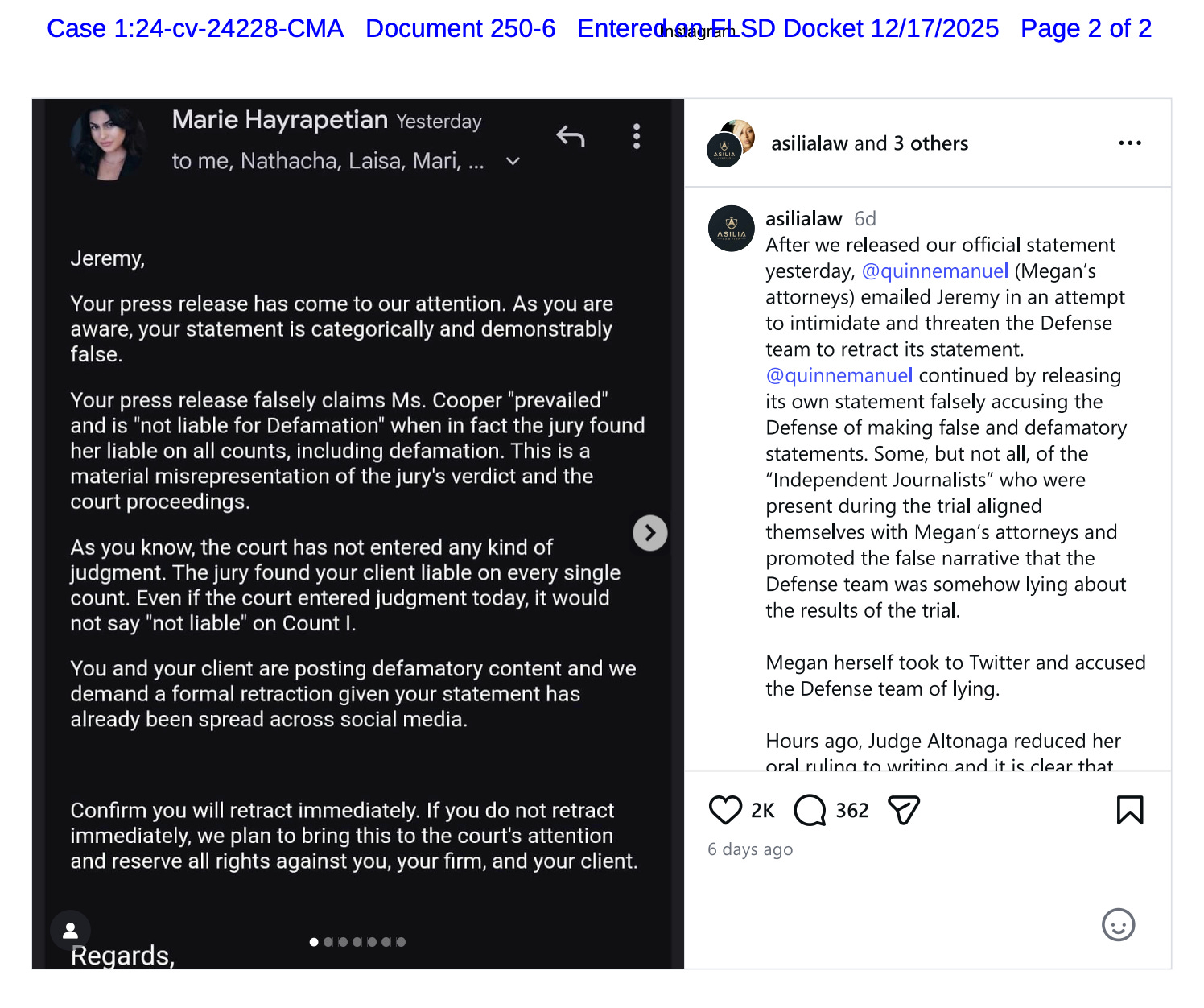 The filing includes a copy of McLymont’s law firm’s Instagram post about the email, which has no identifying information beyond the names of attorneys. Megan’s lawyers says Milagro and McLymont “cast what actually occurred in court in a false light.”