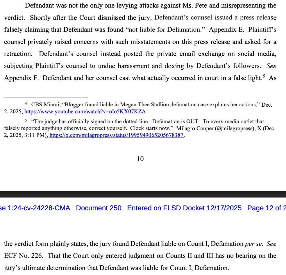 The complaint about McLymont supposedly misrepresenting the verdict seems off, too. Yes, the jury found Milagro liable for defamation. But Judge Altonaga pretty soon after said she was entering judgment only for intentional infliction of emotional distress and the video promotion because the jury said Milagro should be treated as a media defendant, and Megan’s lawyers didn’t serve her with a cease-and-desist notice before suing her as Florida law requires of media defendants.