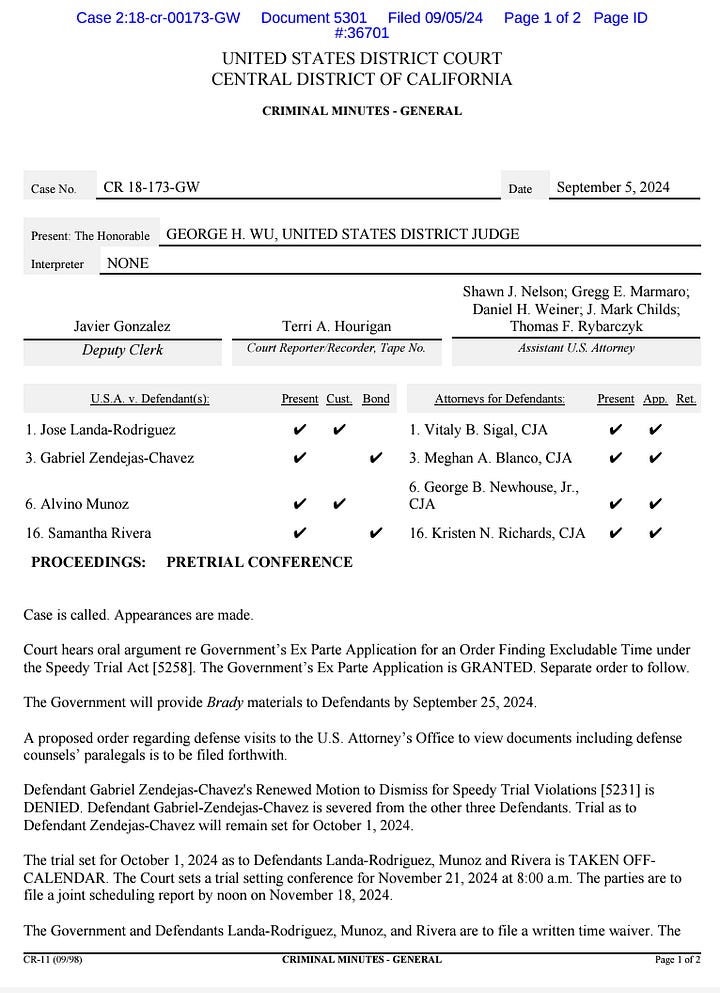 Judge Wu issued a tentative ruling regarding Blanco’s Brady dismissal motions, but it is not publicly available. According to a transcript of the Sept. 5 hearing, he “did not find that the government intentionally failed to comply with Brady.”