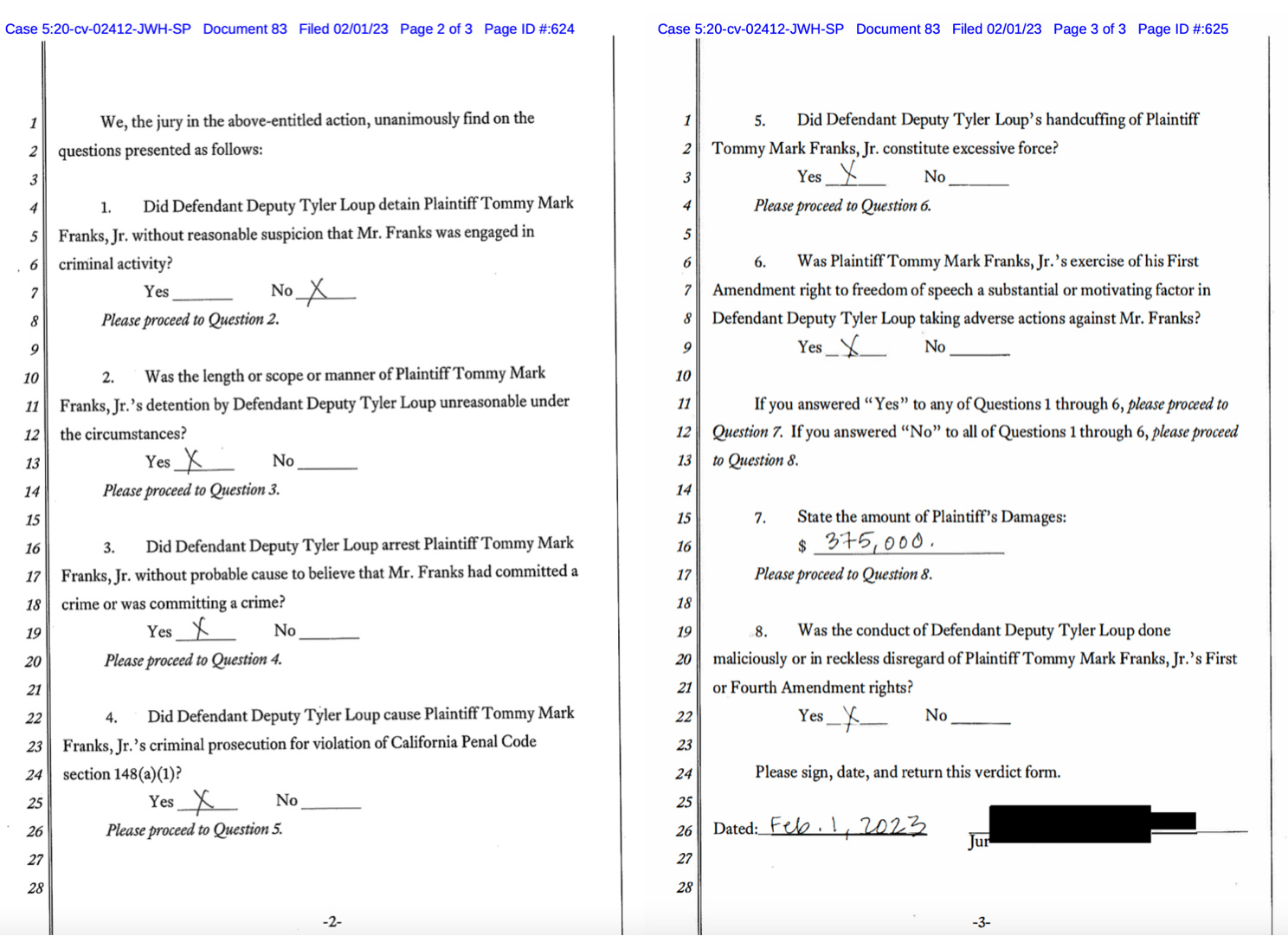 The jurors didn’t stop there. They also determined Loup caused Franks to be prosecuted for resisting police, and that his handcuffing of Franks constitutes excessive force. They also said Franks’ exercise of his right to free speech was “a substantial or motivating factor” in Loup “taking adverse actions” against him, according to the verdict form, and they concluded Loup did so “maliciously or in reckless disregard” for Franks’ First or Fourth Amendment rights.
