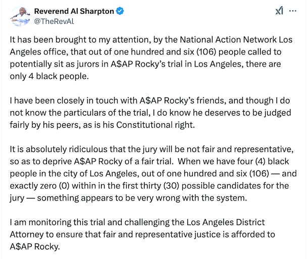 “It is absolutely ridiculous that the jury will be not fair and representative, so as to deprive A$AP Rocky of a fair trial,” Sharpton wrote.