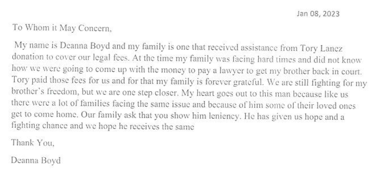 Two other letter writers told Herriford that Lanez paid their families’ fees for lawyers seeking to free their long-imprisoned family members. Deanna Boyd said her family “was facing hard times and did not know how we were going to come up with the money to pay a lawyer to get my brother back in court.”