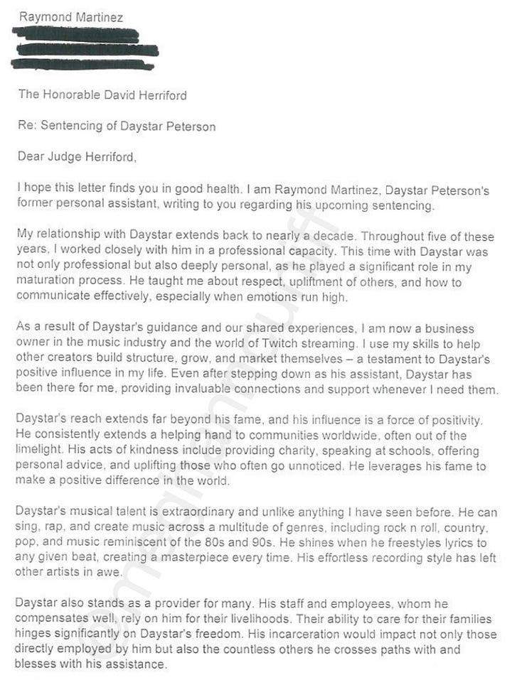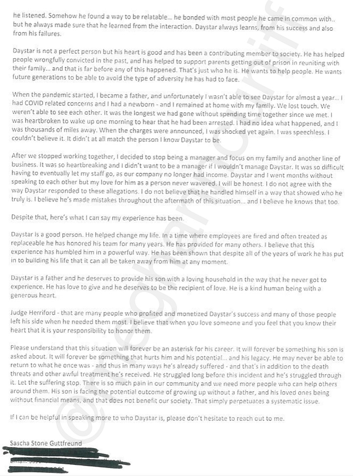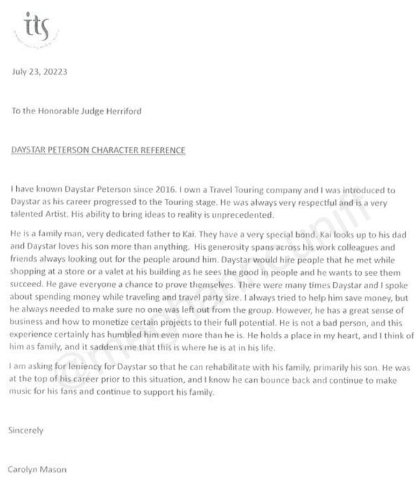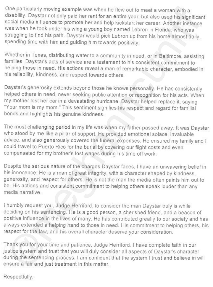 “There were many times Daystar and I spoke about spending money while traveling and travel party size. I always tried to help him save money, but he always needed to make sure no one was left out from the group,” Mason wrote to Judge Herriford. “He was at the top of his career prior to this situation, and I know he can bounce back and continue to make music for his fans and continue to support his family.”