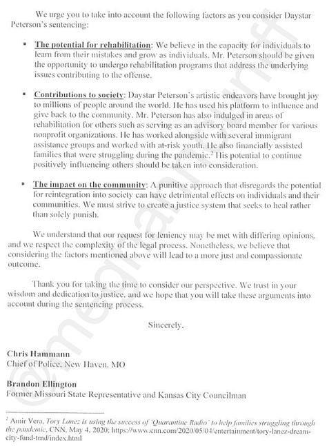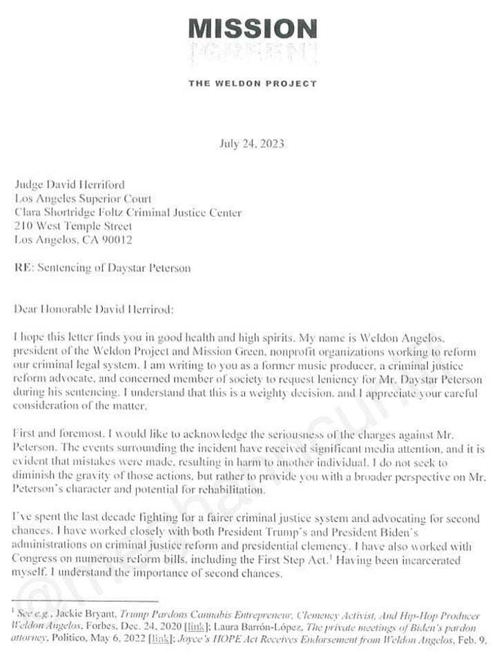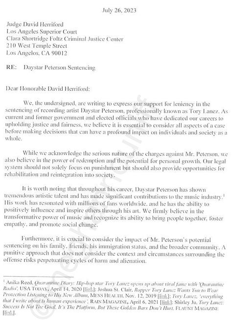 “While we acknowledge the serious nature of the charges against Mr. Peterson, we also believe in the power of redemption and the potential for personal growth,” according to the July 26 letter, referring to Lanez’s legal name, Daystar Peterson. “Our legal system should not solely focus on punishment but should also provide opportunities for rehabilitation and reintegration into society.”