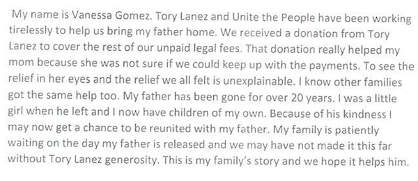 Vanessa Gomez wrote that Lanez and Unite the People “have been working tirelessly to help us bring my father home.” Lanez paid her family’s legal fees, which she said “really helped my mom because she was not sure if we could keep up with the payments.”