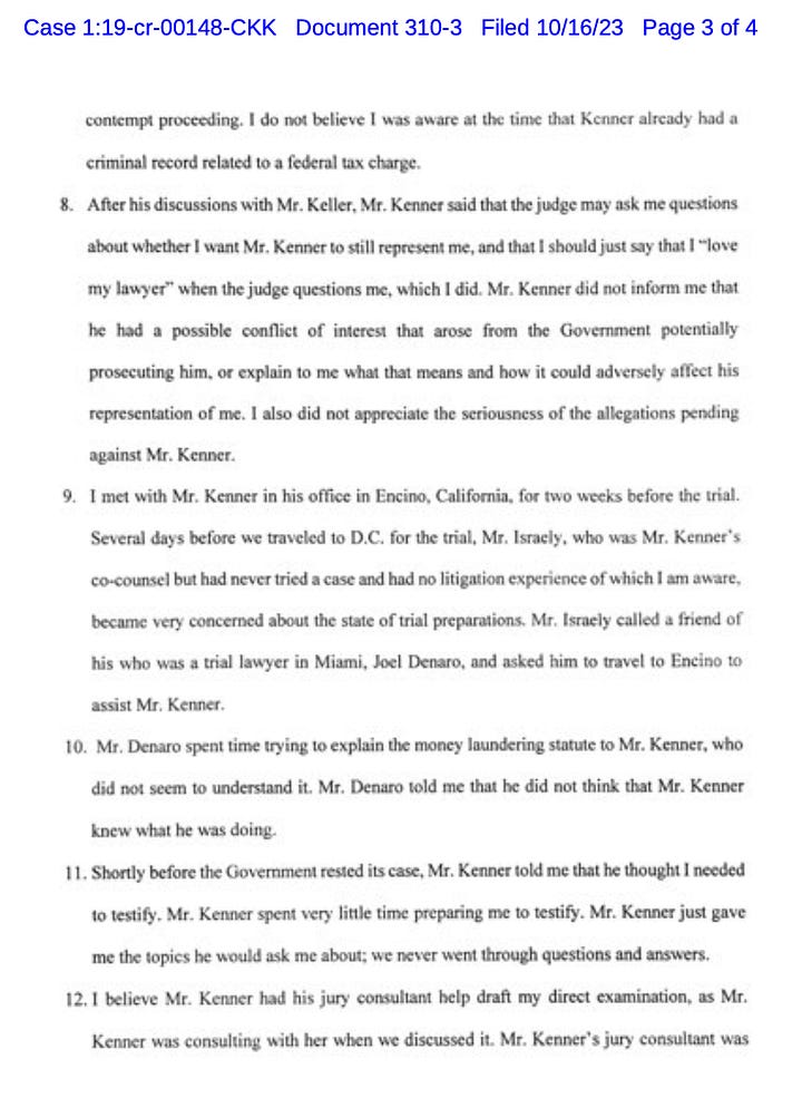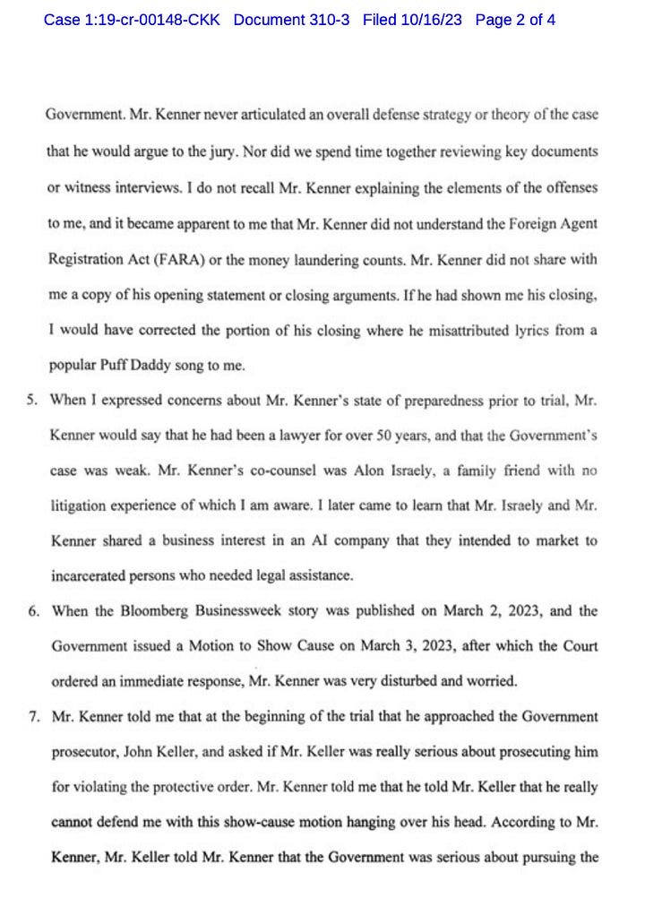 “If he had shown me his closing, I would have corrected the portion of his closing where he misattributed lyrics from a popular Puff Daddy song to me. When I expressed concerns about Mr. Kenner’s state of preparedness prior to trial, Mr. Kenner would say that he had been a lawyer for over 50 years, and that the Government’s case was weak. Mr. Kenner’s co-counsel was Alon Israely, a family friend with no litigation experience of which I am aware. I later came to learn that Mr. Israely and Mr. Kenner shared a business interest in an AI company that they intended to market to incarcerated persons who needed legal services.”
