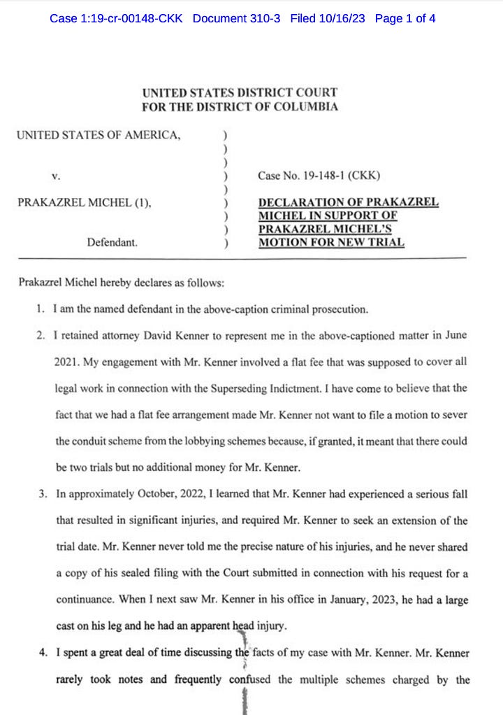 “Mr. Kenner did not inform me that he had a possible conflict of interest that arose from the Government potentially prosecuting him, or explain to me what that means and how it could adversely affect his representation of me,” according to Michel’s declaration. “I also did not appreciate the seriousness of the allegations pending against Mr. Kenner.”