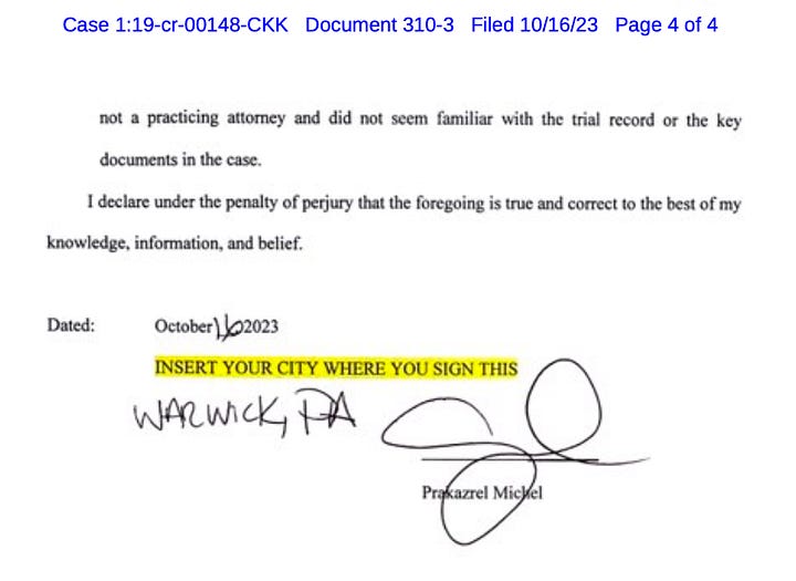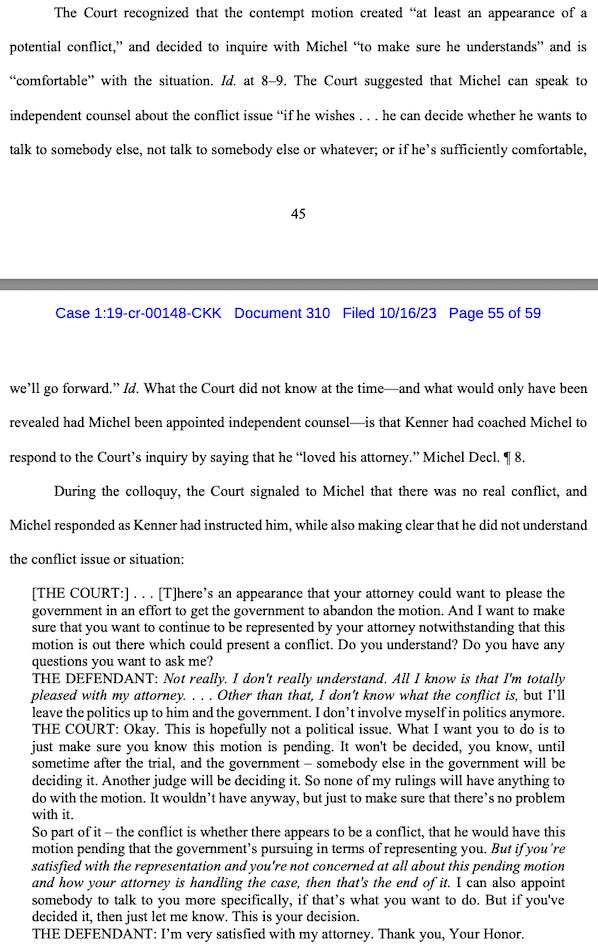 Judge Kollar-Kotelly held the charges in abeyance until after trial, but neither she nor prosecutors recused until three days into trial, and Michel’s new lawyers say Kenner was motivated to curry favor with them to try to protect himself. They also say Michel didn’t understand the significance of the situation, and they highlighted his discussion with Judge Kollar-Kotelly as evidence.